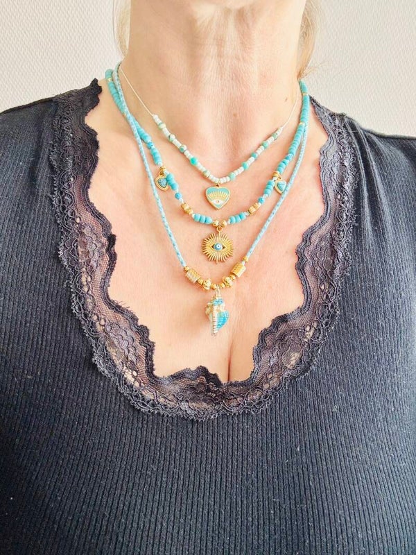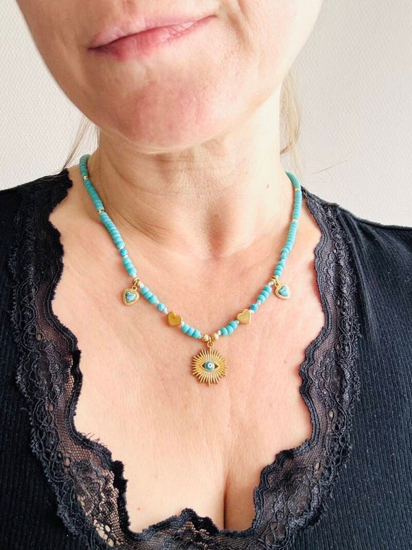 Mooie handgemaakte halsketting van 6 mm blauwe rocailles glaskralen, turkoois facet natuursteentjes, kleine hartjes, hartbedels en boze oog bedel.